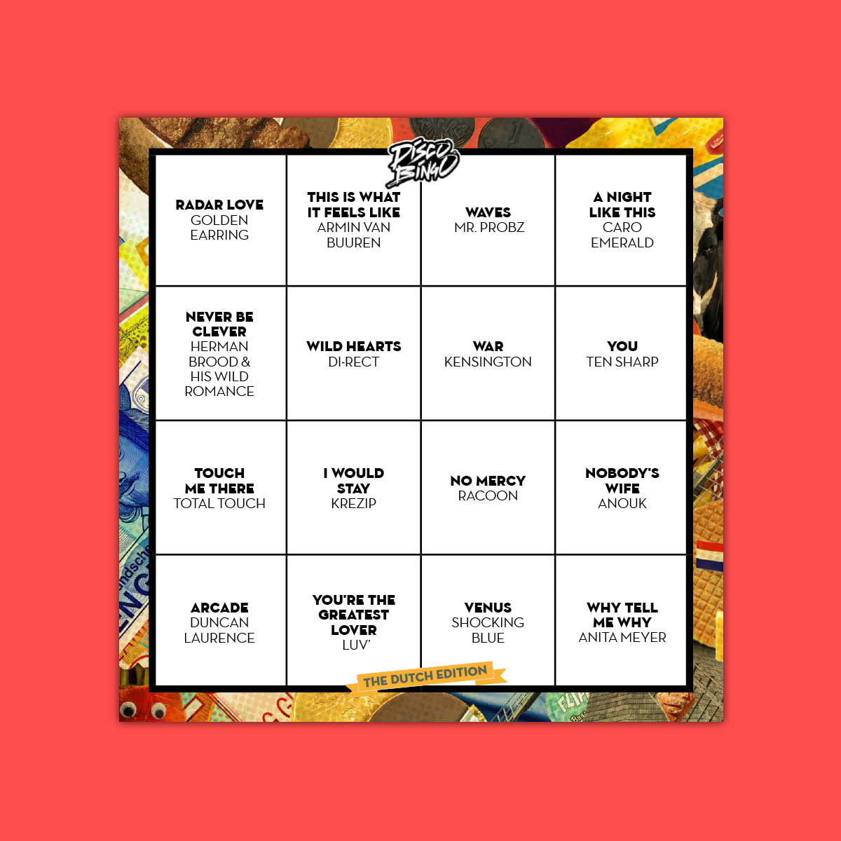 Disco Bingo The Dutch Edition... 'Huh?', hoor ik je zeggen, 'er is toch al The Holland Edition?' Dat klopt! Maar The Holland Edition bestaat uit Nederlandstalige liedjes. En deze editie bestaat uit Engelstalige liedjes van Nederlandse bodem. If you snap what I mean. Dus Engelse liedjes gemaakt en gezongen door Nederlanders. Met bijvoorbeeld Golden Earring, Krezip, Anouk en Shocking Blue. Eigenlijk gewoon een hele lekkere playlist.