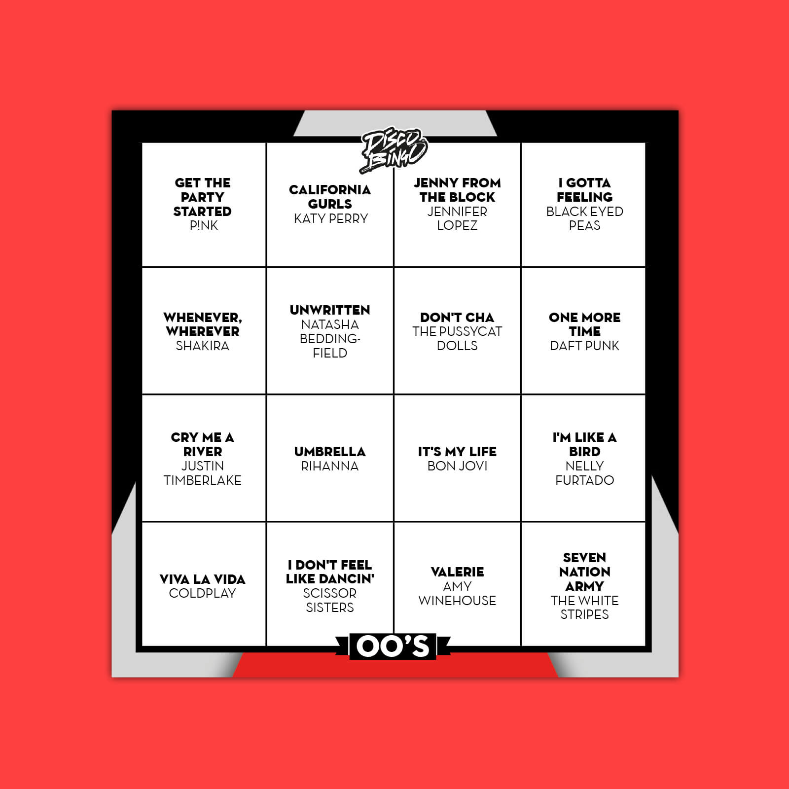 Die Nullen, die Nullen, die Nuller, die 00er oder wie auch immer Sie es nennen wollen; Der Beginn dieses Jahrhunderts hat uns sehr schöne Musik beschert. Und eine Liste der besten Songs finden Sie in dieser Ausgabe von Disco Bingo. Spielen Sie dieses Musik-Bingo jetzt mit Ihren Freunden und genießen Sie: