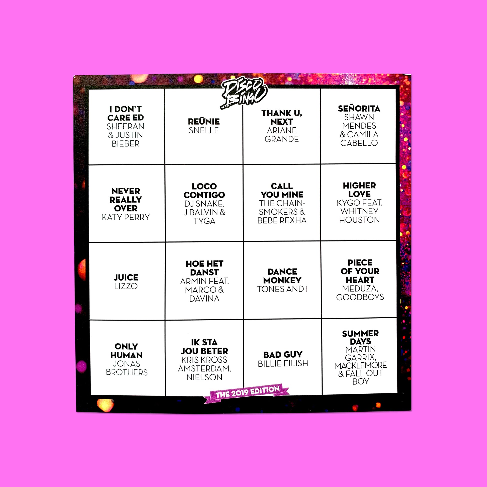 Habt ein schönes Jahr, 2019! Eine Playlist voller Slides, Banger und Mitsinglieder. Auf vielfachen Wunsch etwas niederländischer als frühere Listen. Vervollständigen Sie Ihre Party mit dieser Ausgabe von Disco Bingo für alle Altersgruppen. Garantierter Erfolg! Unter anderem mit Lizzo, Tones and I und Katy Perry.