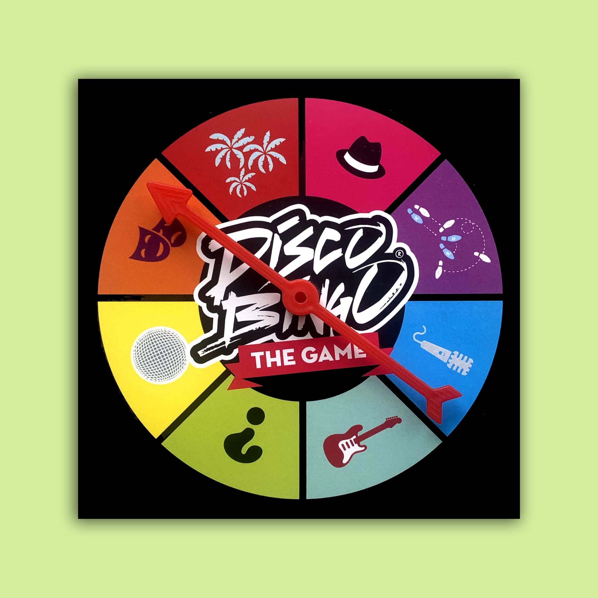Der Drehteller mit Pfeil. Dadurch wird Ihr Bingo auf ein höheres Niveau gehoben und das Spiel macht noch mehr Spaß. Drehen Sie den Pfeil und sehen Sie, wo er endet. Vielleicht am Mikrofon, was natürlich bedeutet, dass ein Lied gesungen werden muss, aber auch Tanzen, Luftgitarre, Quizfragen und vieles mehr gehören dazu.
